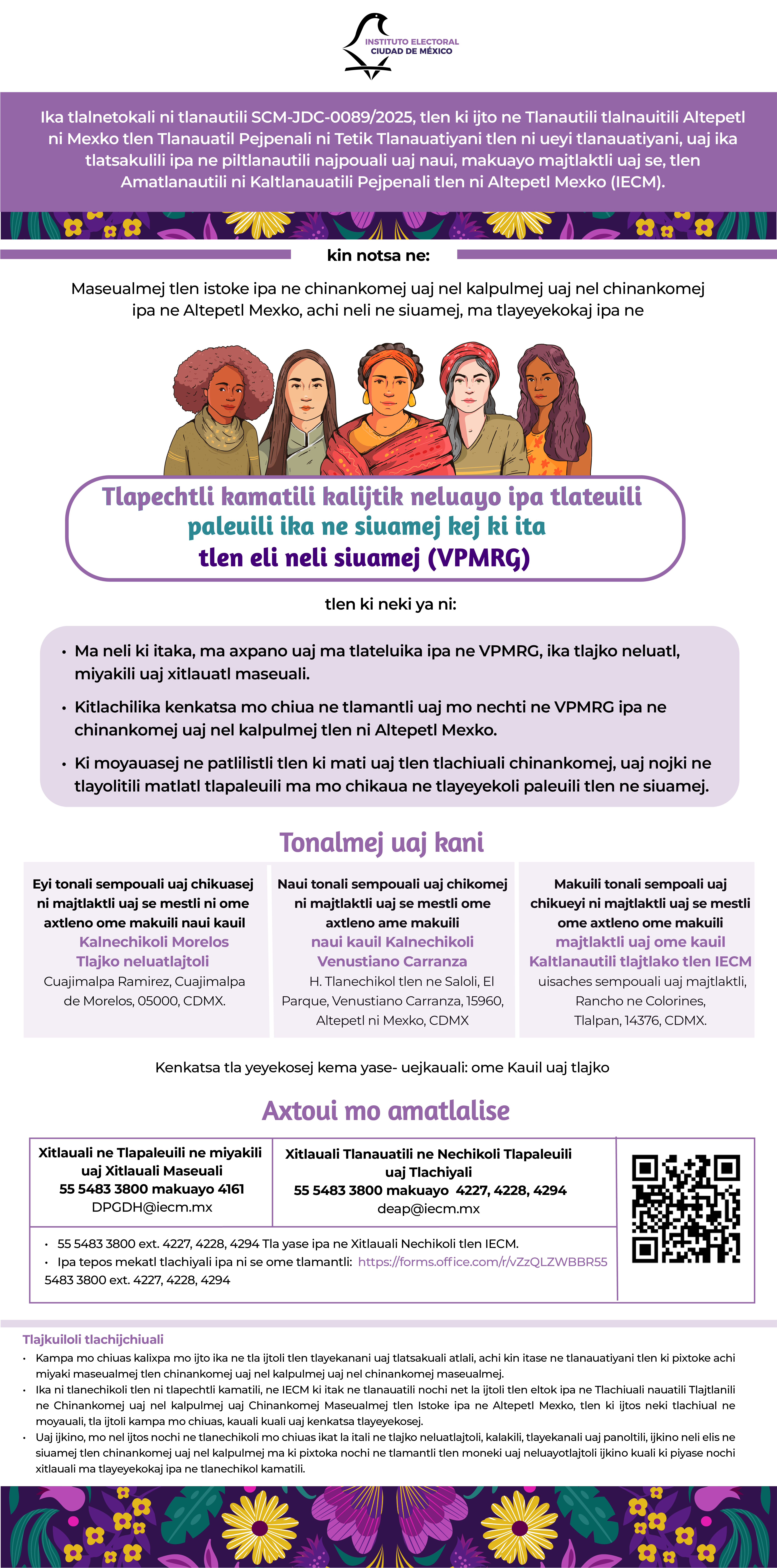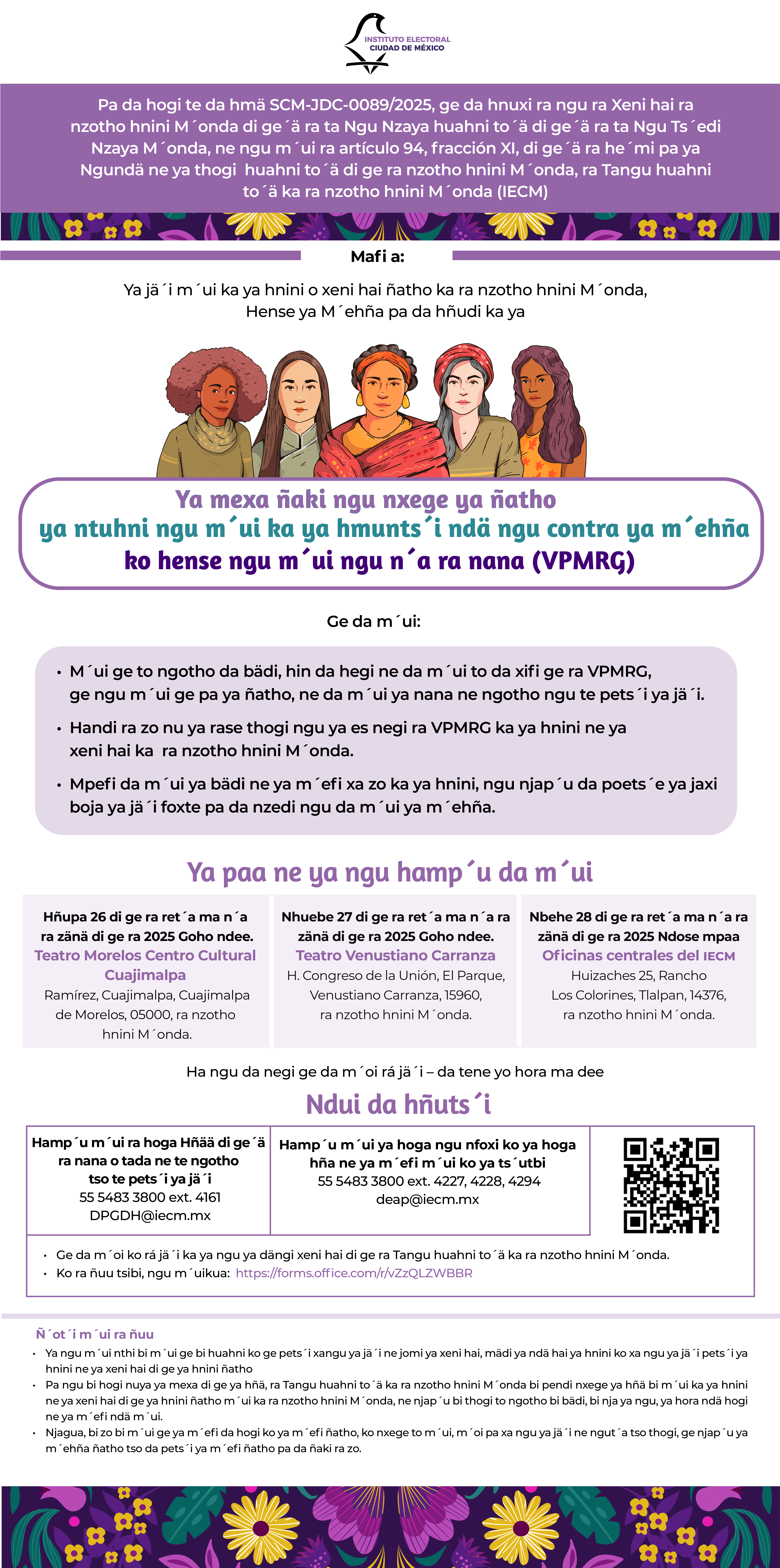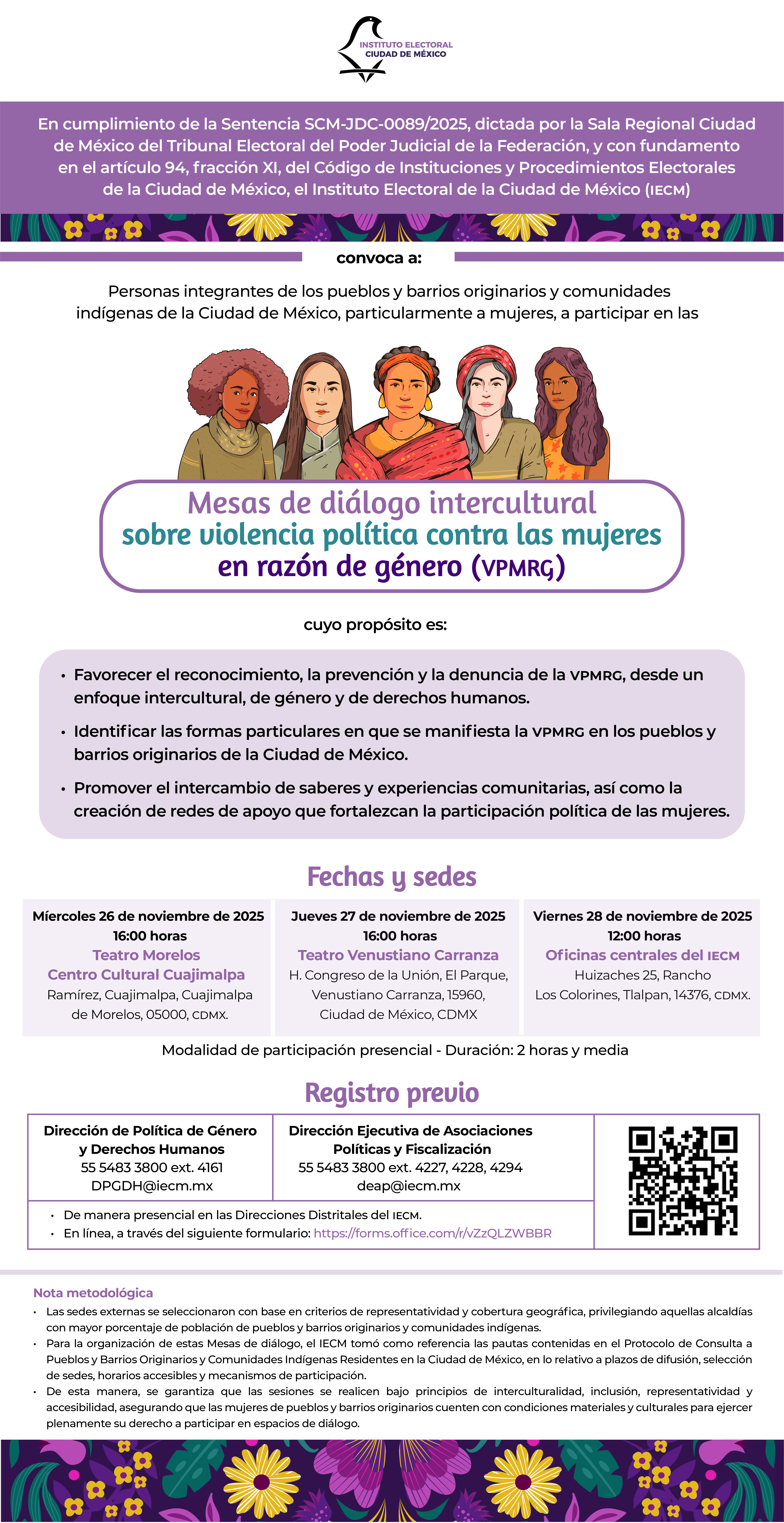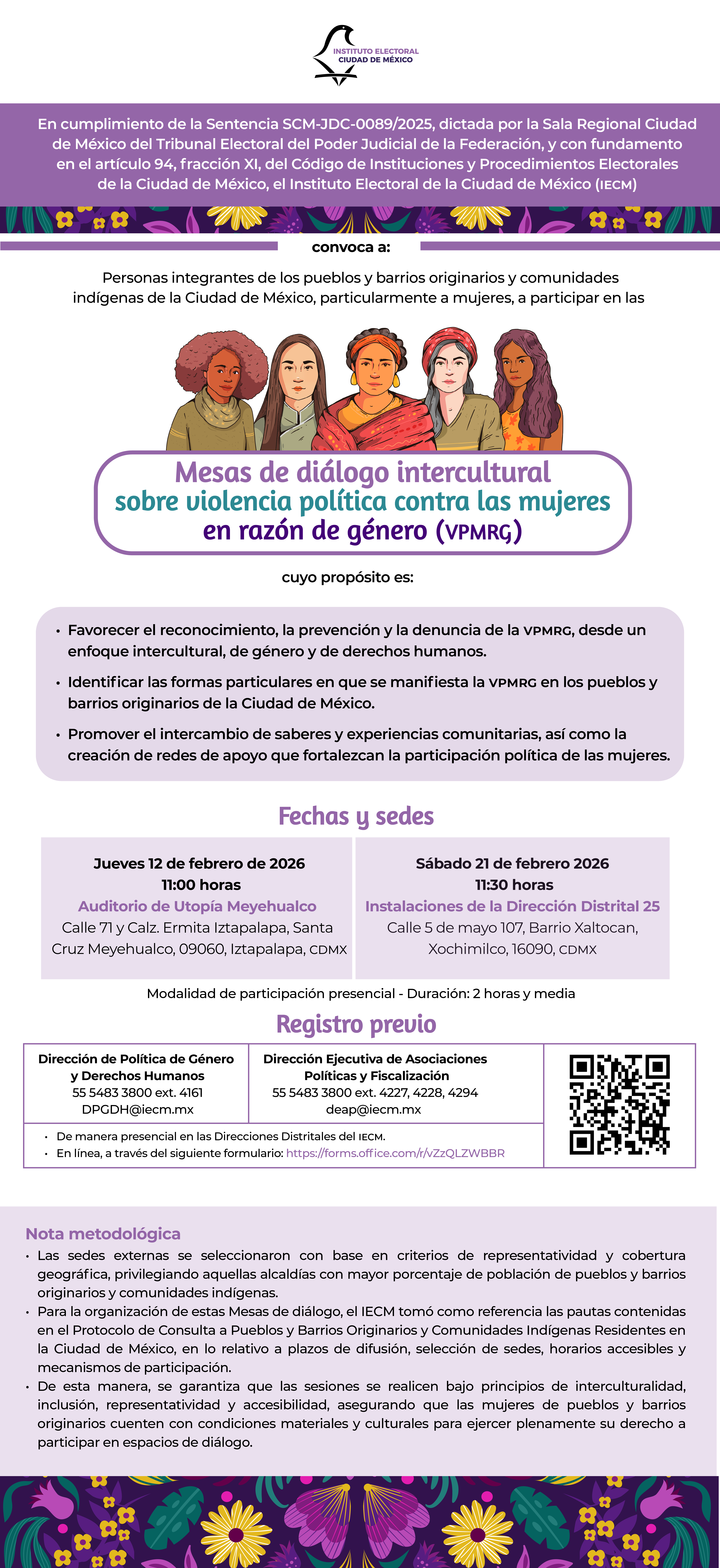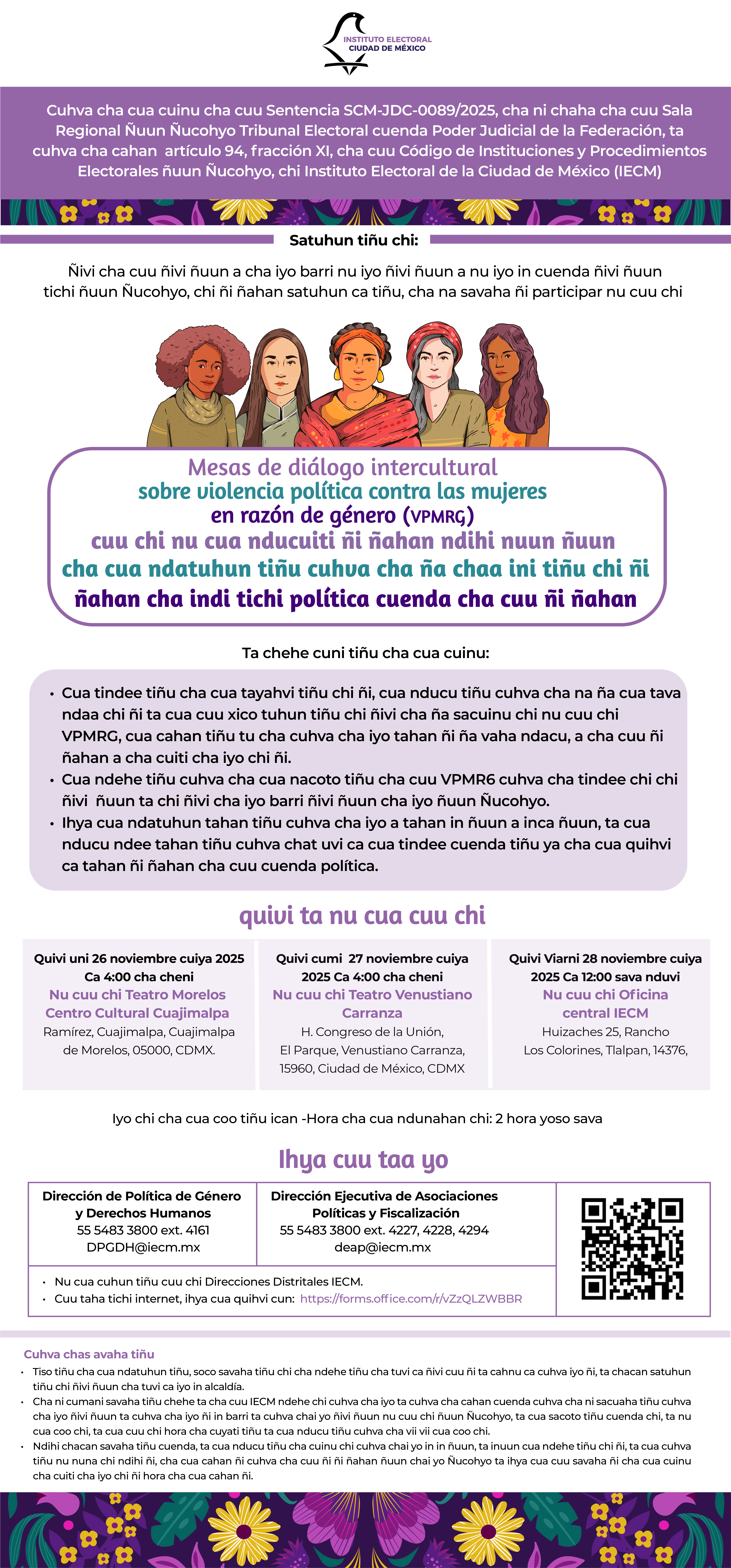 En cumplimiento de la Sentencia SCM-JDC-89/2025, dictada por la Sala Regional Ciudad de México del Tribunal Electoral del Poder Judicial de la Federación, el Instituto Electoral de la Ciudad de México (IECM) invita a las Mesas de diálogo intercultural sobre violencia política contra las mujeres en razón de género (VPMRG).