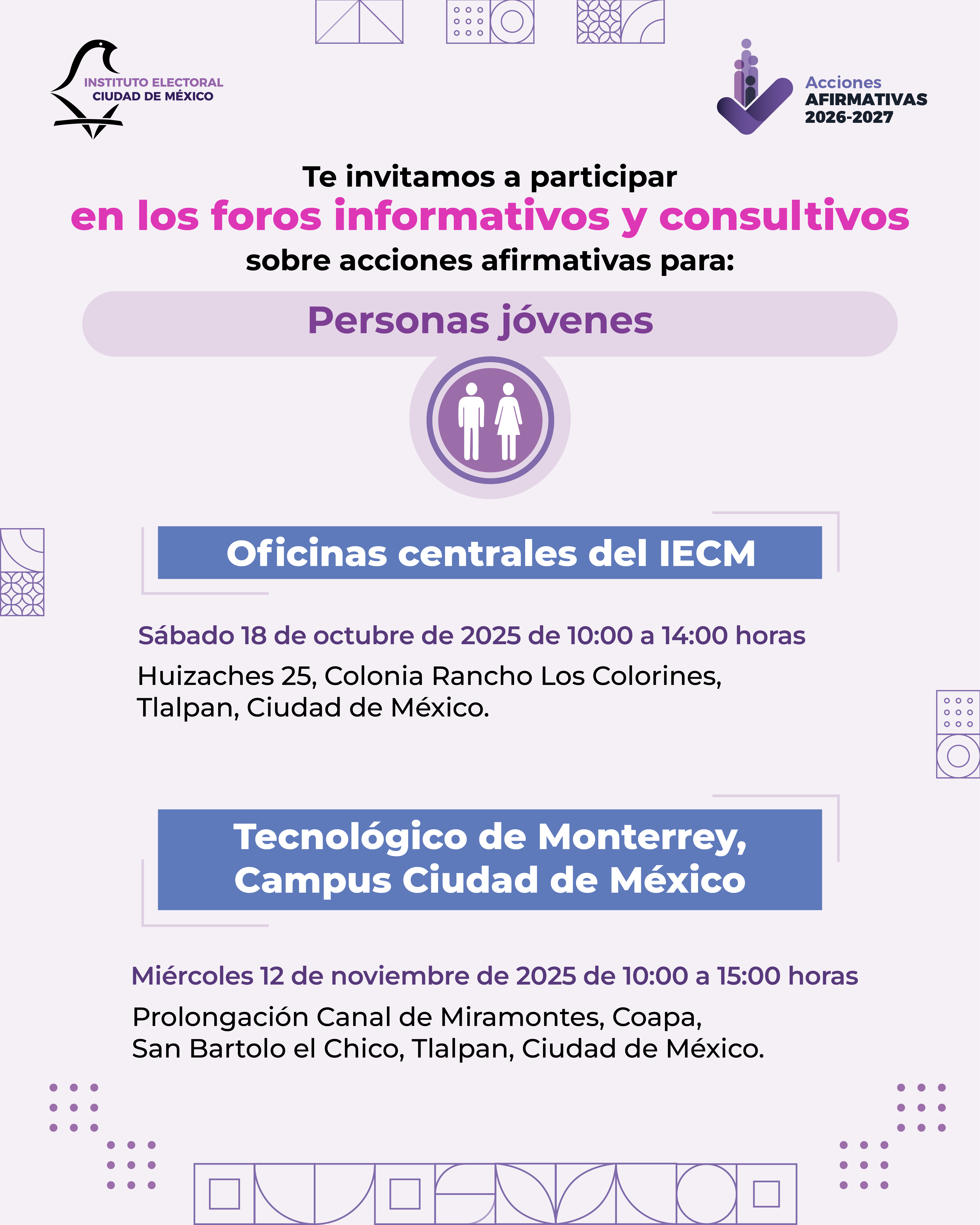 Consulta la Convocatoria las consultas a personas jóvenes, mayores, con discapacidad y de la diversidad sexual y de género sobre acciones afirmativas en la postulación de candidaturas en el Proceso Electoral Local Ordinario 2026-2027.