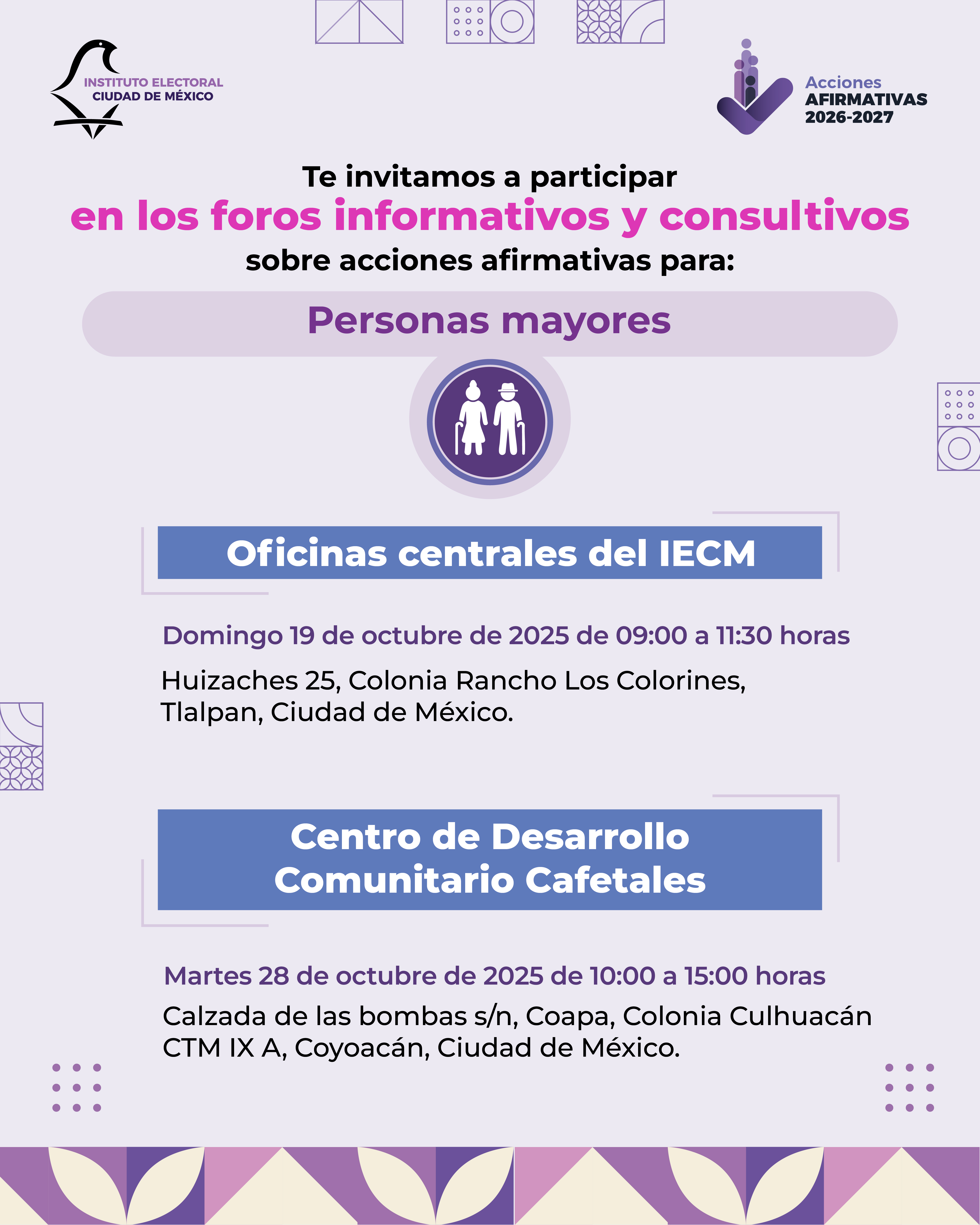 Consulta la Convocatoria las consultas a personas jóvenes, mayores, con discapacidad y de la diversidad sexual y de género sobre acciones afirmativas en la postulación de candidaturas en el Proceso Electoral Local Ordinario 2026-2027.